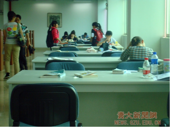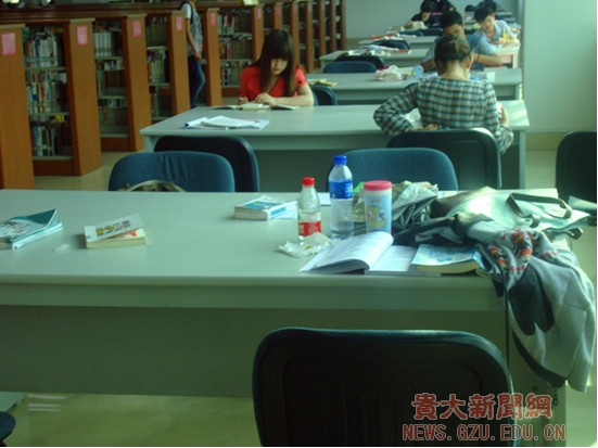 新闻网讯(记者团 黄蕾瑾 卓琳 摄影报道) 近期由于英语四六级以及各科期末考试的陆续到来,很多学生都希望可以寻找到一个较好的复习环境,因而图书馆成为众多学生青睐之地,由此也多了许多占座现象。 WHAT:考试月临近催生图书馆“占座热” 人文学院2011级的管同学向记者抱怨,平日下课来新图书馆二楼三楼找位置还是比较容易的,但如今,背着书包,在两层楼里很难找到一个空着的位子。但现实的情况是,很多位子并没有人坐,而是已被学生用书、水杯或者书包占着,以待来图书馆后可以直接就坐学习。 现象:座位长时间闲置浪费资源 5月12日下午3时许,记者来到北校区新图书馆,发现此时图书馆剩余的座位已经不多,仅在一楼的报纸阅览区还有部分空座。在一楼的期刊阅览区,空着七八个座位,但都摆放着书籍或背包。记者顺着楼梯上到二楼的图书阅览区,看到右窗的一张四人桌前,仅有一名女生在座,其余三个座位上放有背包、书本以及一台笔记本电脑。记者环绕二楼整个阅览区,发现32张阅览桌共有128个座位,有35个左右的空位,但都被书本、背包、水杯等物品“占领”。