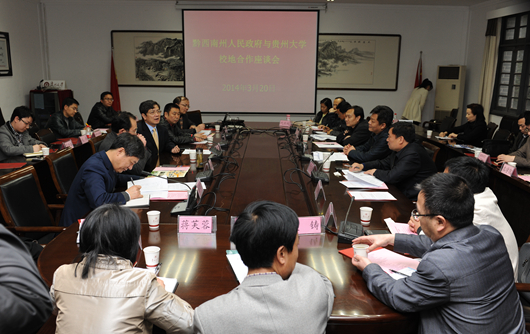 贵大新闻网讯(记者 庞爱忠)3月20日下午,黔西南州人民政府常务副州长汤向前率队来校商谈继续深化合作事宜,黔西南州政府副州长曾孔祥,政协副主席黄健勇、黄榜泉,州政府秘书长刘兴吉,我校校长郑强,副校长金道超、刘勇,助理巡视员谢田凯出席,黔西南州农委、驻贵阳办公室、旅游局、人社局、设计院以及我校校办、宣传部、对外合作处、科学技术研究院、哲学社会科学研究院、旅游与文化产业学院、土木工程学院、材料与冶金学院、资源与环境工程学院、农学院、继续教育学院等单位负责同志参加。
