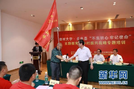 贵州大学副校长金道超为乡村振兴战略专题培训班授旗,贞丰县委常委、组织部部长陈磊接旗(李柏锋 摄)