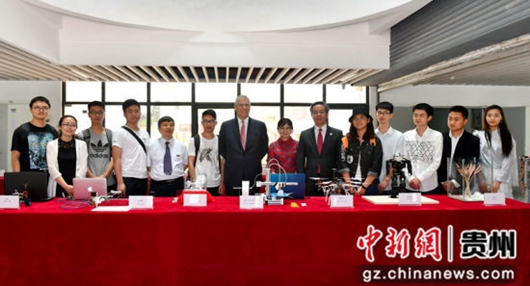 “你们很聪明!第一架无人机制作者耗时六个月才完成作品,而你们只用了一个月。”安德鲁王子在贵州大学科技园一楼参观学生作品时亲切地对同学说道。搜救无人机、搏击机器人、并联臂3D打印机、自动绘图机……每观看一个作品展示,安德鲁王子都会驻足与同学们互动交流,询问设计理念、讨论科学知识。安德鲁王子还参观了解了贵州大学学生的国际设计竞赛获奖作品、体量分析作业等,并在国家大学科技园黔龙众创空间简要了解了学生创新创业方面情况。