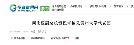 5月31日上午,冈比亚副总统坦巴章在总统府接见贵州大学代表团一行。冈比亚高等教育、研究与科技部长朱夫、中国驻冈比亚大使张吉明、冈比亚大学校长安钧参加会见。