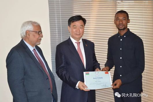马大使为获得中国大使奖学金的同学颁奖并合影留念。