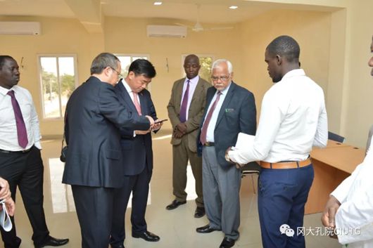 冈比亚大学孔子学院中方院长范朝康向马大使汇报了孔子学院的筹建情况以及贵州大学为揭牌仪式所做的策划方案。
