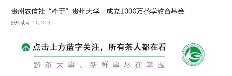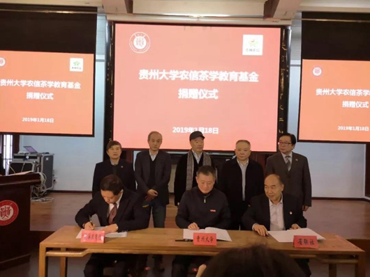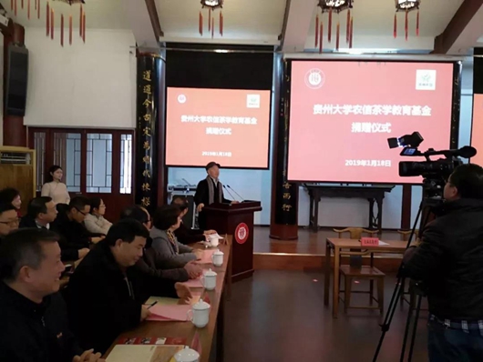 2019年1月18日,“贵州大学农信茶学教育基金”捐赠仪式在贵州大学中国文化书院举行。贵州省农村信用社向贵州大学捐赠1000万元,成立茶学教育基金,发展贵州茶学文化。