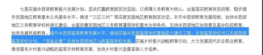 提升中西部高等教育发展水平,继续实施中西部高等学校基础能力建设工程、东部高等学校对口支援西部高等学校计划,‘部省合建’支持中西部地区14所高等学校发展。实施乡村振兴战略教育行动,大力发展现代农业职业教育,推进服务乡村振兴战略的高等农林教育改革,加快乡村振兴急需紧缺人才培养。”