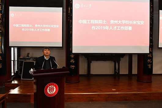 贵州大学校长宋宝安院士作2019年人才工作部署。他用详实数据和具体实例,就为什么引入人才、应该如何引入人才两方面问题,进行了深入而细致的解答。他表示,师资队伍建设是一流大学建设的关键,学校能否抓牢“部省合建”和“双一流”建设重大发展机遇,关键在于人才队伍能否高质量建设。他对各学院、各科研机构未来开展人才工作提出三点要求,一是要凝聚共识,明确主体责任;二是要广开“才”路,点面结合,主动出击;三是要拓展思路,引流互补,缓解人才流失。他希望,举全校之力凝聚一心、群策群力,共同打造一支业务精湛、创新能力强的人才队伍,共同开创贵州大学人才工作新局面。