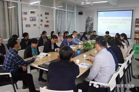 3月21日上午,贵州师范学院举行专题座谈会,传达学习习近平总书记在学校思想政治理论课教师座谈会上的重要讲话精神。党委副书记严肃,马克思主义学院教师代表,各学院党委书记、团委书记、辅导员代表,学工部、校团委工作人员等参加学习座谈。座谈会由学工部副部长郝进欣主持。