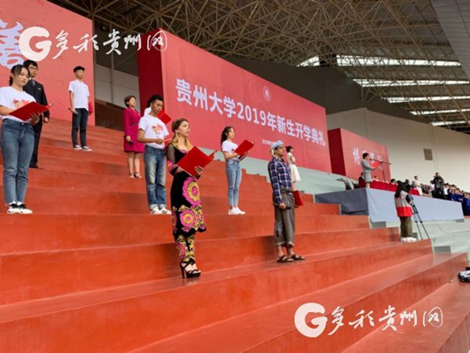 随后,全体新生郑重地将见证学校一百多年风雨历程和辉煌成就、凝聚着一代代贵大人赤子情怀和庄严责任的校徽佩戴在胸前,从此正式成为贵大一员。