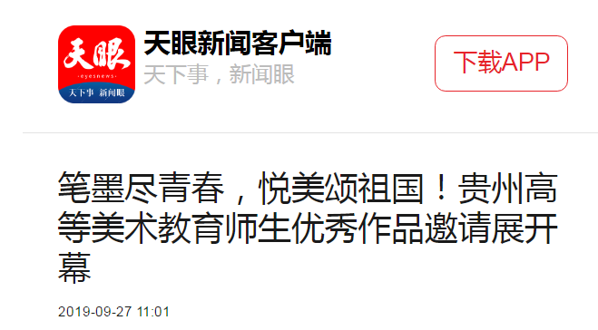 9月26日上午,“笔墨尽青春,悦美颂祖国”全省14所美术专业院校师生参与的“贵州高等美术教育师生优秀作品邀请展”在贵州大学美术学院美术馆开幕。师生们用手中的笔墨勾勒出简洁明快的线条、描绘出喜悦灵动的符号、铺陈出丰富多彩的颜色,共同用国画、油画、版画、雕塑以及设计和剪纸作品等艺术的方式为美丽中国的70华诞交上了一份高质量、有特色的答卷。