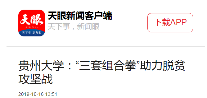 在脱贫攻坚工作中,贵州大学做好顶层设计和工作部署,以植物保护世界一流建设学科为引领,整合全校资源,充分发挥学科优势、人才优势和平台优势,坚定地把科研论文写在贵州大地上,聚焦贵州省12个特色优势产业,聚力打好科技扶贫、教育扶贫和校农结合“三套组合拳”,探索出具有贵大特色的“三套组合拳”扶贫模式。
