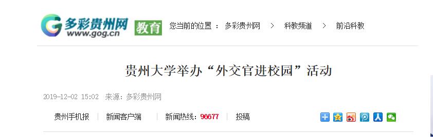 近日,省教育厅联合省外事办公室在贵州大学开展了“外交官进校园”活动,邀请三名著名外交官走进学校,为师生作外交工作领域报告。