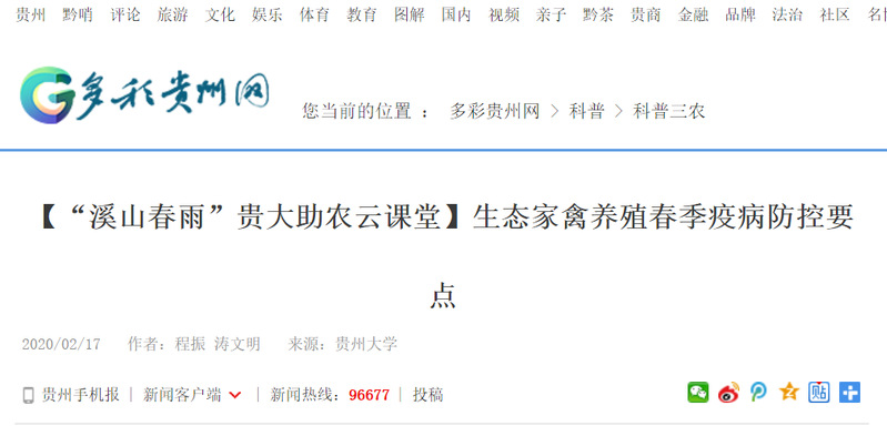 春季是畜禽补栏旺季,活畜禽调运频繁,候鸟回迁,重大动物疫情传入和发生的风险非常高。如何做好春季生态家禽疫病防控工作?疫情期间,贵州大学生态畜牧产业团队专家为养殖户提供了生态家禽养殖春季疾病防控要点。