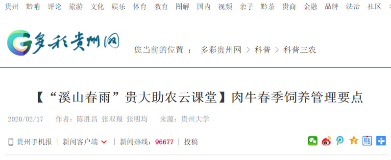 春季到来,天气开始转暖,肉牛各项机能开始复苏,是产犊和配种的高峰期。但病菌的活动也同时逐渐增强,气候不太稳定,时有倒春寒出现,春季肉牛最易感染疾病。抗疫期间,贵州大学生态畜牧产业技术服务专家团队对肉牛的饲养管理提供四大技术“宝典”,保证肉牛的繁殖效率和较快的生长速度。