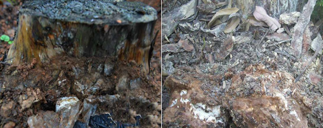 挖出的树蔸,可用同样办法进行削皮留筋及码晒。未挖出的树蔸,应选择伐过不久、尚未腐朽、无白蚁栖居者,将地上部分削皮留筋,同时挖开蔸旁土层,砍断根1m以外的侧根,将露出土面的较粗侧根削去部分根皮,进行日晒干燥。