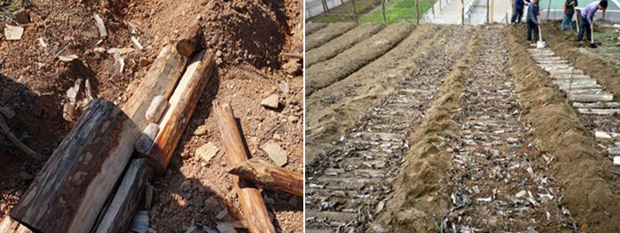段木接种方法:在林地挖好的窖内先挖松底土,再摆放段木1~2层,使其留筋部位靠紧,周围用沙土填紧,接上引种,使段木与菌种紧密吻合,最后用沙土填实封窖。