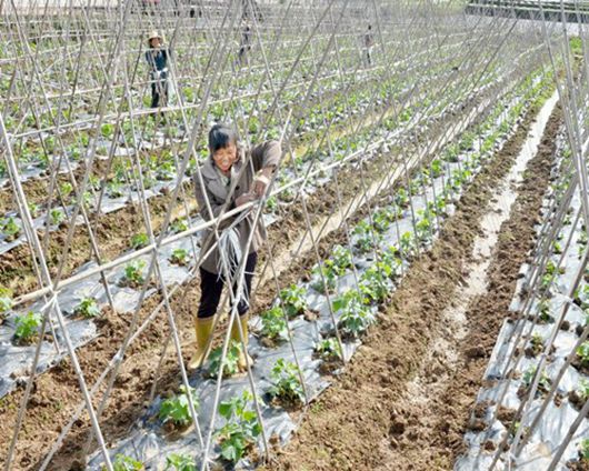 直播的,每孔播种子约3粒。黄瓜苗出土、顶膜时,立即破膜。破膜后遇干旱天气,应早晚逐株浇水。齐苗7天后定苗,每孔留1株健壮苗,并浇1次水。瓜苗约有4叶,即“甩头”时,插人字形支架,绑架要牢固,防止被大风、大雨吹歪偏倒,并及时引蔓上架,防止相互缠绕,避免雨水将植株叶片溅上泥土,影响其光合作用,绑蔓时,使瓜蔓在架上分布均匀,促使多结瓜,同时,及时摘除叶卷须和下部老叶、病叶等。