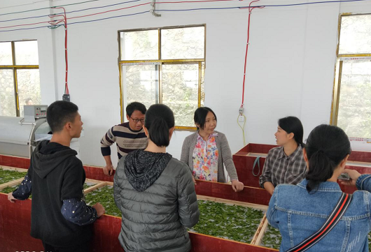 随后,团队来到青山镇托家地马氏白龙古茶树专业合作社,对前期生产的茶样进行感官审评,与合作社成员就茶样存在的问题进行分析,并提出了改进措施。针对四球古茶原料的特殊性,团队成员对茶青原料进行现场加工,详细讲解每一步工序的技术要领。手把手指导社员进行茶样理化检测分析,并对加工车间卫生状况、资料建档等薄弱环节提出了整改措施。