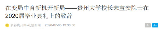 7月4日上午,“永葆赤子之心 不负青春韶华”贵州大学2020届学生毕业典礼暨学位授予仪式举行。仪式采取现场、网络直播的方式,主会场设在贵州大学西校区阅湖广场,分会场设在各学院,未到场及未返校毕业生通过网络收看的方式参与。贵州大学党委书记李建军、校长宋宝安院士等出席。宋宝安以《在变局中育新机开新局》为题致祝词,多彩贵州网、众望新闻客户端全文刊发,以飨读者。