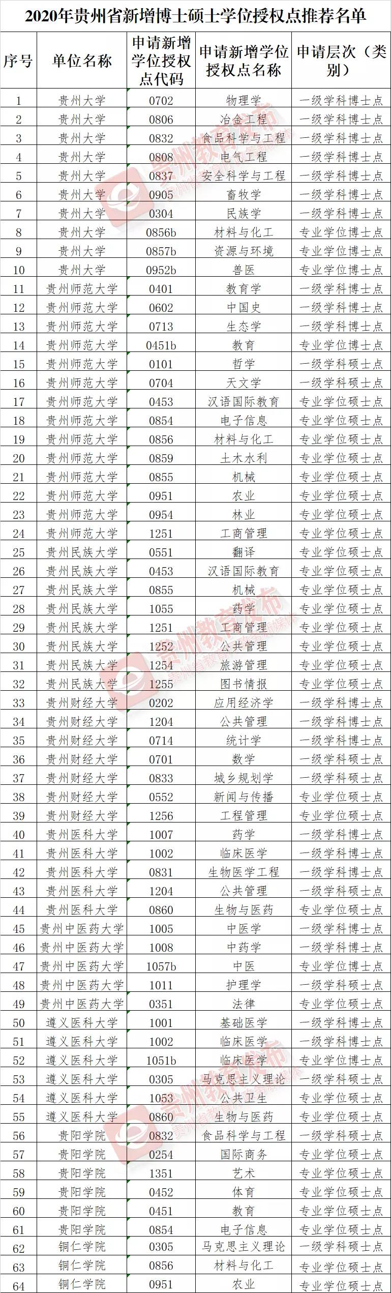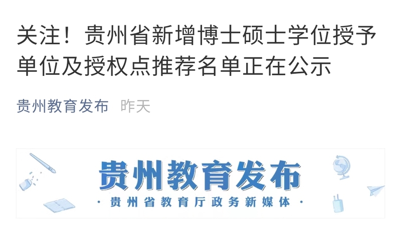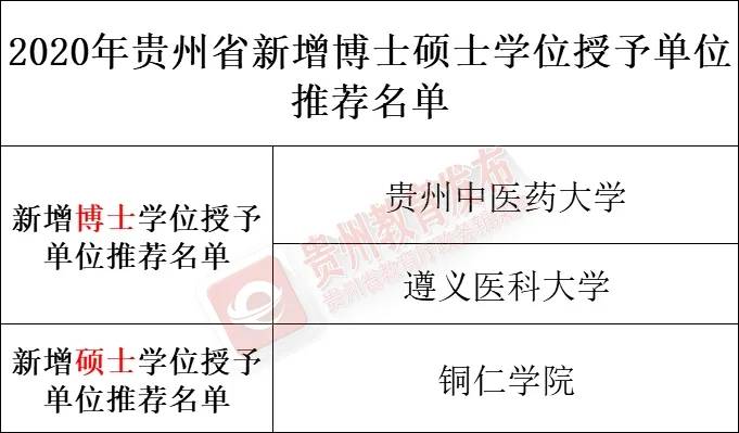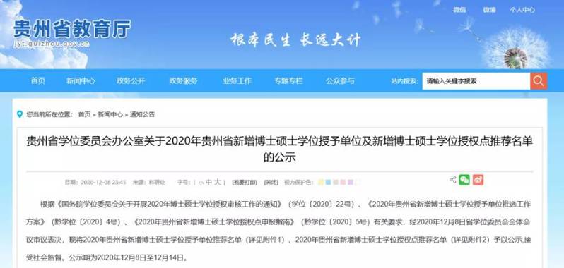 根据《国务院学位委员会关于开展2020年博士硕士学位授权审核工作的通知》等文件有关要求,经2020年12月8日省学位委员会全体会议审议表决,现将2020年贵州省新增博士硕士学位授予单位推荐名单、新增博士硕士学位授权点推荐名单予以公示。