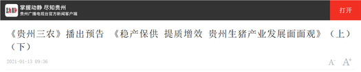 非洲猪瘟疫情发生以来,我省生猪产业发展面临巨大压力,省委、省政府及时贯彻落实党中央国务院的系列决策部署,坚决扛起政治责任,积极主动担当作为。及时将生猪产业从生态畜牧业中单独剥离出来,作为全省农村产业革命12大特色优势产业来抓。眼下,新春佳节渐渐临近,我们贵州的生猪产能恢复的情况究竟怎样?市场上生猪的供应能否满足我们老百姓过年以及日常生活的需求?为了让观众朋友们能对我省生猪产业有一个比较全面的了解,《贵州三农》节目特地邀请了贵州省农业农村厅党组成员、副厅长——张元鑫;贵州省农业农村厅总兽医师、省生猪产业发展工作专班常务副班长——唐隆强;贵州大学教授、省生猪专班副班长——张勇;贵州省养猪行业协会会长、贵州黔昌公司的董事长——王跃章,四位嘉宾做客我们的演播厅,就我省生猪产业发展的情况进行总结与展望,《贵州三农》特别访谈节目 《稳产保供 提质增效 贵州生猪产业发展面面观》(上)将于1月13日20:10播出,《稳产保供 提质增效 贵州生猪产业发展面面观》(下)将于1月15日20:10播出,敬请观看。