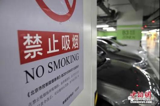 图为北京一地下停车场张贴的禁烟公告。