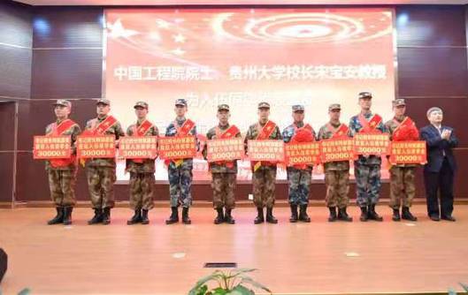 贵州大学校长、征兵工作领导小组组长宋宝安院士为入伍同学代表颁发“书记校长特别嘉奖·应征入伍奖学金”,并为即将毕业的应征入伍毕业生提前颁发毕业证。