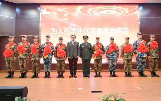 参会校领导和嘉宾为应征入伍大学生佩戴光荣花。