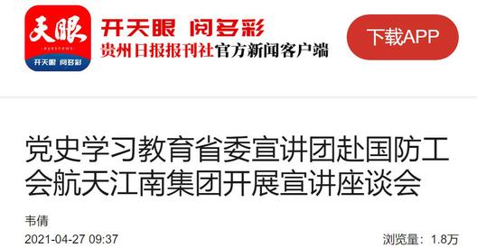 4月26日,党史学习教育省委宣讲团赴国防工会航天江南集团有限公司开展宣讲座谈会,党史学习教育省委宣讲团成员、贵州大学党委书记李建军作宣讲报告。