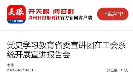 4月25日,党史学习教育省委宣讲团走进工会系统,在省总工会机关北七楼会议室开展宣讲报告会,党史学习教育省委宣讲团成员、贵州大学党委书记李建军作宣讲报告。