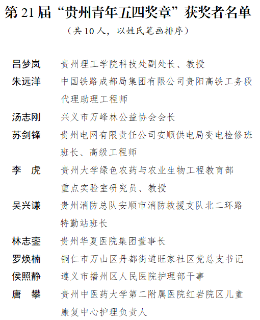 在五四青年节来临之际,近日,第21届“贵州青年五四奖章”评选揭晓。贵州省人力资源和社会保障厅、共青团贵州省委、贵州省青年联合会决定,授予吕梦岚等10名同志第21届“贵州青年五四奖章”,授予“山鹰”教练机青年技术保障团队等5个青年集体第21届“贵州青年五四奖章集体”。