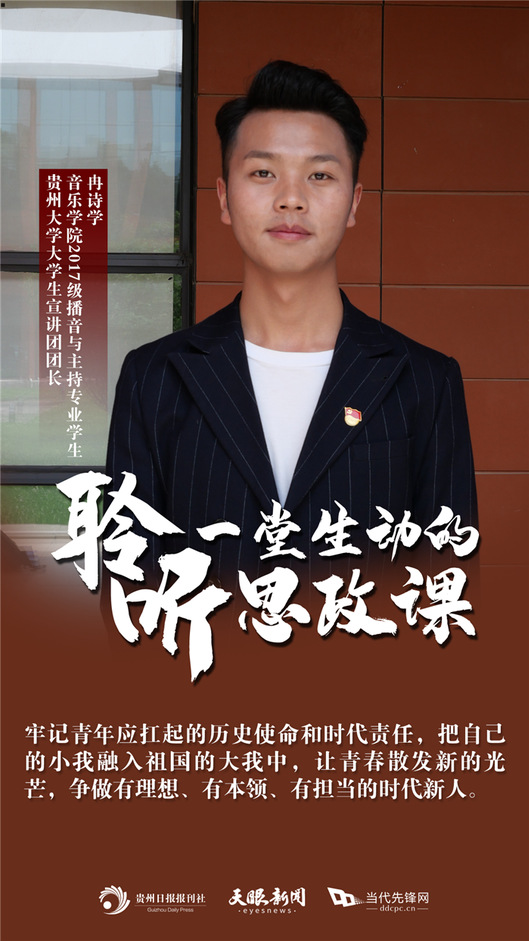 冉诗学表示,作为新时代青年,生逢其时,自己更要努力学习掌握科学知识,提升内在素养,锤炼过硬本领,不负光阴、不负韶华。“未来,我将坚定理想信念,牢记青年应扛起的历史使命和时代责任,把自己的小我融入祖国的大我中,让青春散发新的光芒,争做有理想、有本领、有担当的时代新人,为开创百姓富生态美多彩贵州新未来、实现中华民族的伟大复兴贡献自己的青春力量。”