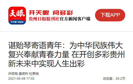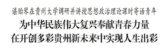 在习近平总书记视察贵州大学10周年之际,5月8日,省委书记、省人大常委会主任谌贻琴到贵州大学调研,参加贵州共青团主题团日示范活动,并为高校师生讲授思想政治理论课,与青年学子一起回顾我们党、我们国家辉煌历程、一起重温习近平总书记对贵州的关心关怀。她寄语全省广大青年,要牢记习近平总书记殷切嘱托,仰望星空立大志,止于至善明大德,博学笃行成大才,脚踏实地担大任,为中华民族伟大复兴奉献青春力量,在开创多彩贵州新未来中实现人生出彩。
