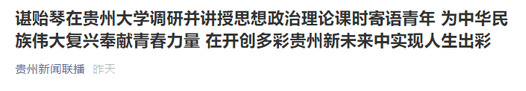 内容提要:在习近平总书记视察贵州大学10周年之际,5月8号,省委书记、省人大常委会主任谌贻琴到贵州大学调研,参加贵州共青团主题团日示范活动,并为高校师生讲授思想政治理论课,与青年学子一起回顾我们党、我们国家辉煌历程、一起重温习近平总书记对贵州的关心关怀。她寄语全省广大青年,要牢记习近平总书记殷切嘱托,仰望星空立大志,止于至善明大德,博学笃行成大才,脚踏实地担大任,为中华民族伟大复兴奉献青春力量,在开创多彩贵州新未来中实现人生出彩。省委常委、省委宣传部部长卢雍政主持报告会,省委常委、省委秘书长吴强,副省长谭炯参加活动。