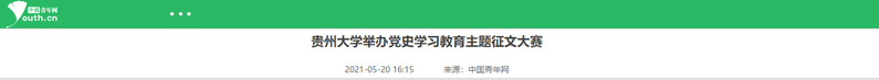 为深入开展党史学习教育和“牢记殷切嘱托、忠诚干净担当、喜迎建党百年”专题教育,5月20日,由贵州大学团委举主办、贵州大学贵大青年融媒体中心承办的“学党史 感党恩 跟党走 庆建党百年”主题征文大赛决赛成绩揭晓。