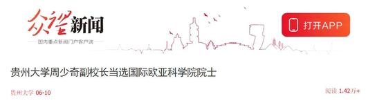 2020年11月14日,国际欧亚科学院中国科学中心第二十三次院士大会在京召开,50位中国学者增选为国际欧亚科学院院士正式候选人,2021年5月底,正式批复为国际欧亚科学院院士。贵州大学周少奇副校长当选国际欧亚科学院院士。