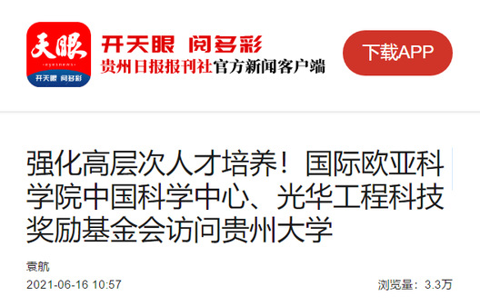 6月15日,光华工程科技奖励基金会副理事长、秘书长董庆九,国际欧亚科学院中国科学中心秘书长刘洪海、副秘书长廖国华等代表团一行到访贵州大学。贵州大学党委书记李建军与代表团就高层次人才培养、科技创新、服务地方经济社会发展等相关话题进行交流。