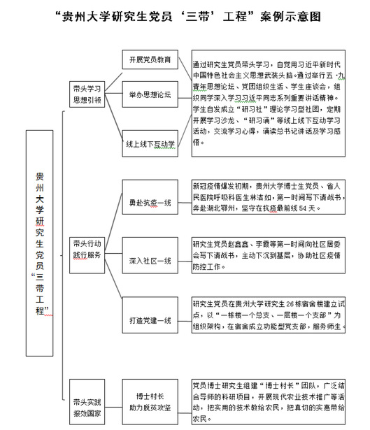 贵州大学研究生党员“三带工程”项目是教育部高等学校书记校长亮点工程项目,贵州大学党委书记李建军、校长宋宝安院士指挥、部署,谋划、统筹推进研究生党员“三带工程”项目;广大研究生党员在关键时刻,带头学习、带头行动、带头实践,自觉按照习近平总书记2011年5月9日在贵州大学五·九讲话中提到的“要不怕吃苦,自找苦吃”的要求,充分发挥党员的先锋模范带头作用,勇担时代使命,通过不断学习和实践,为中华民族伟大复兴砥砺奋进。