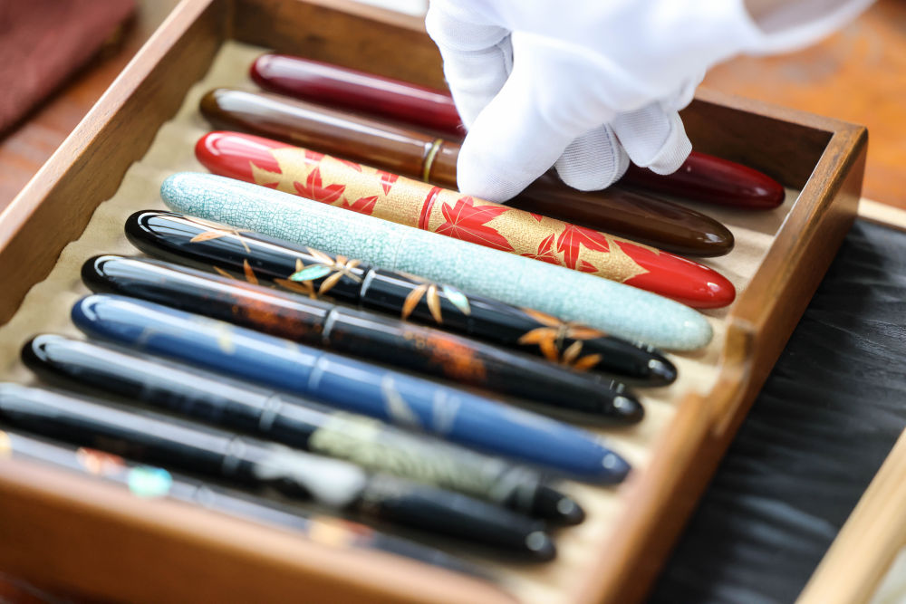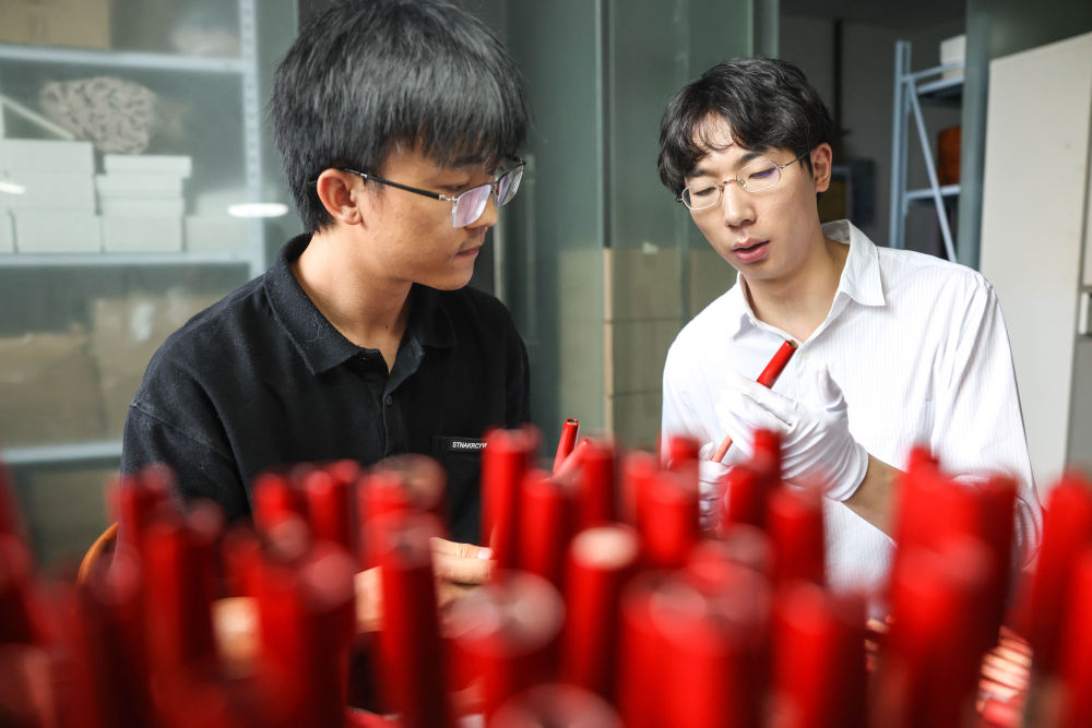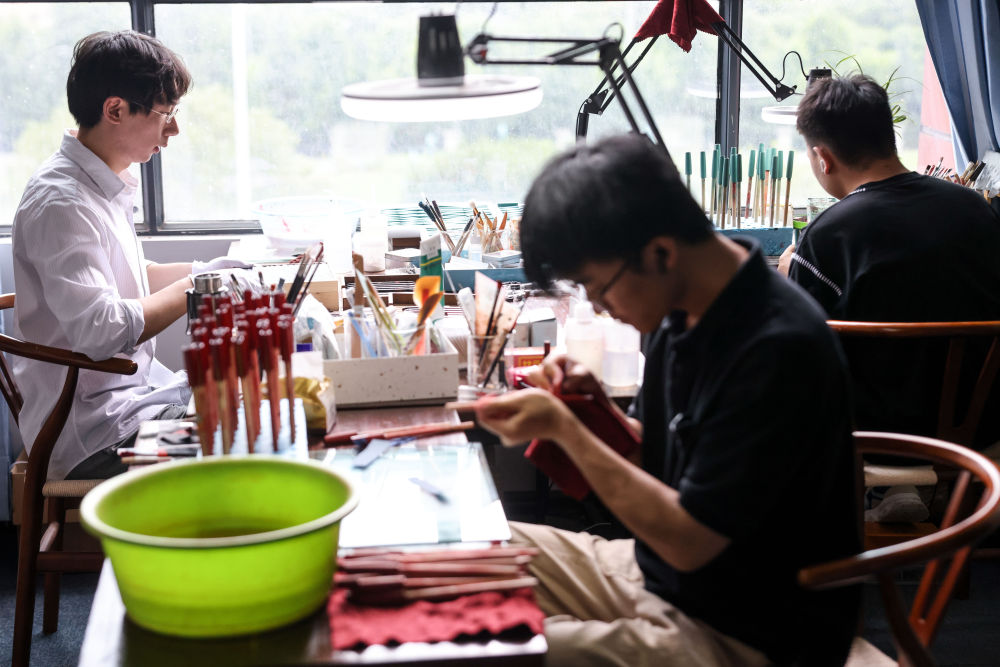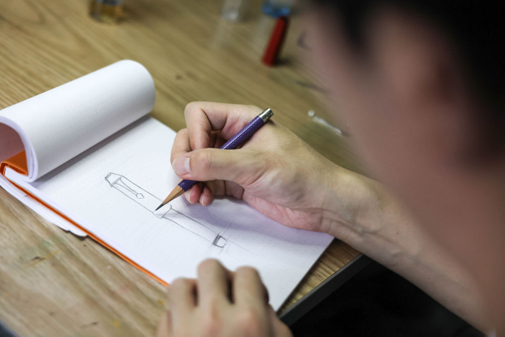 袁建(右)与同事在工作室讨论钢笔制作细节。