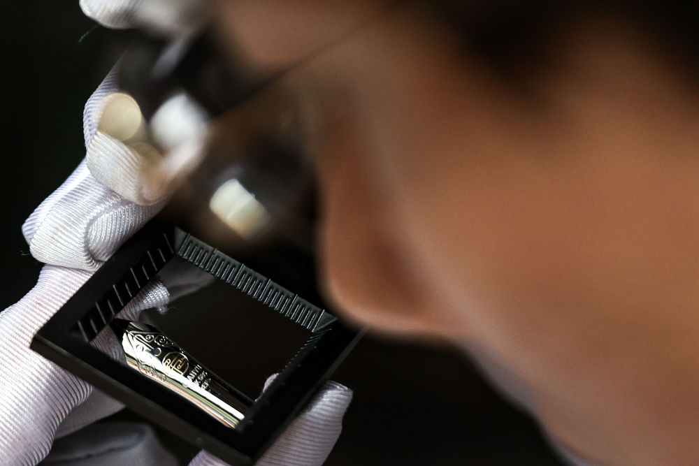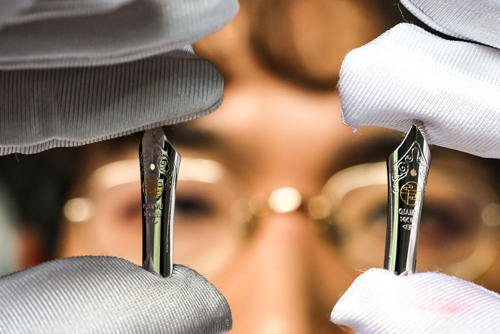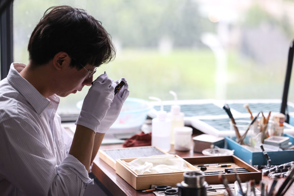 袁建在工作室用放大镜查看钢笔的笔尖成品。