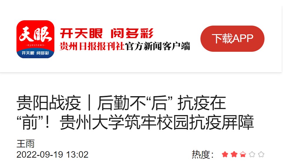 贵阳市本轮疫情发生后,贵州大学后勤管理处迅即响应,第一时间集结后勤在校职工员工总计1360多名,成立应急保障队伍,明确工作职责,承担起餐饮保障、水电保障、场地布置、物资保障、住宿保障、交通保障、环境消杀等工作,全力守护校园安全。