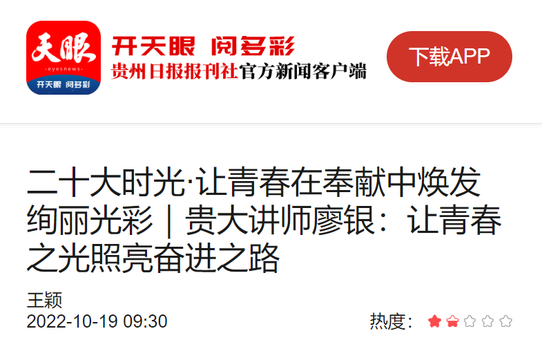 今年是廖银参加工作的第八个年头。作为贵州大学党委宣传部意识形态工作科科长,廖银长期与学生相处,常挂在嘴边的一句话,“有一点光就发一点光,有一点热就发一点热”,这也是他一直传递的价值观。