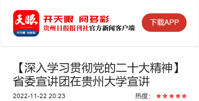 11月22日,学习贯彻党的二十大精神省委宣讲团在贵州大学进行宣讲。党的二十大代表、省委宣讲团成员、贵州大学党委书记李建军作宣讲报告。
