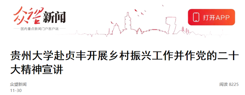 11月29日,贵州大学党委书记李建军率队赴贞丰县冬妹村调研指导乡村振兴驻村工作,看望慰问贵州大学派驻贞丰驻村工作队,并作党的二十大精神宣讲。黔西南州委副书记、贞丰县委书记涂妍出席调研座谈会。贵州大学党委副书记令狐彩桃,副校长漆思、张大林陪同。冬妹村村支两委干部、部分村民代表,贵州大学派驻贞丰驻村工作队全体成员,省医挂职干部,学校党委办公室、党委组织部、对外合作处有关负责人参加。会议由令狐彩桃主持。
