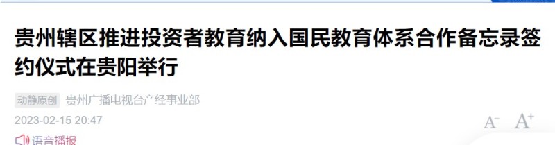 加强投资者教育,将投教纳入国民教育体系是资本市场全面深化改革的一项重要基础性工作。为加强互利合作,不断丰富和完善投资者教育纳入国民教育体系工作格局,2月15日,贵州证监局联合上海证券交易所、贵州省地方金融监管局、贵州大学、华创证券举办的《合作备忘录》签约仪式在贵阳举行。