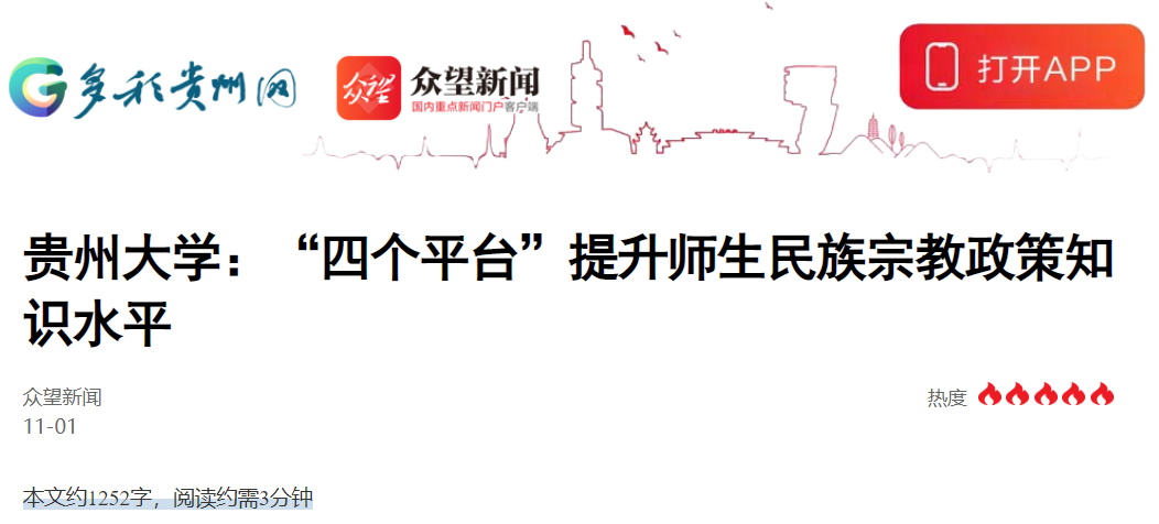 贵州大学党委始终坚持以习近平新时代中国特色社会主义思想为指导,深入学习宣传贯彻落实习近平总书记关于加强和改进民族工作的重要思想以及习近平总书记关于宗教工作的重要论述,坚持“防范在前、教育在先”的工作原则,多形式、多渠道开展党的民族宗教工作方针政策及国家宗教法律法规宣传教育,引导广大师生树立马克思主义民族观和宗教观,防范化解校园民族宗教工作领域风险,奋力构建平安和谐的校园环境。