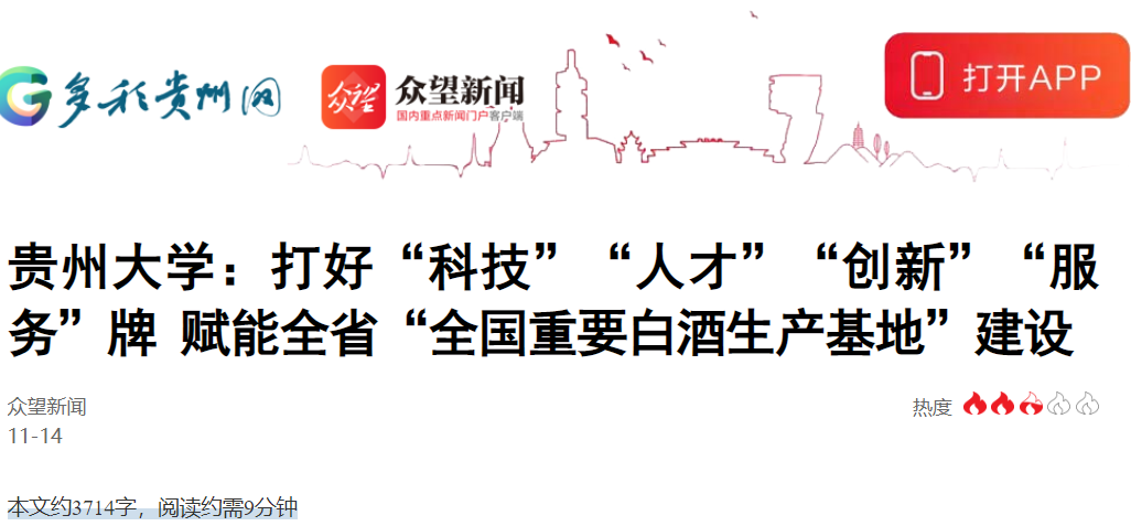 此外,贵州大学优质烟酒产业团队独立或联合贵州茅台、贵州习酒、贵州国台等企业,围绕提升全国白酒基地高质量建设,先后开展赤水河流域酿造环境微生物生态结构、发酵微生物结构、酒体风味结构之间的内在科学机制等基础研究,推动白酒酿造重点科技成果的应用转化;优化制曲、制酒、勾调等关键生产技术工艺难题;与16家企业开展酒体设计、酿造标准体系提升、酿造微生物解析等方面的合作,为企业解决酒体品质差、酱香白酒焦糊味重、产酒率低等技术难题,新增经济效益3000余万元;与4家企业开展酒糟窖底水转液态饲料技术研发、酒糟中提取食用香精技术研发、果酒研发及优质酱香型白酒智能酿造等合作,解决了白酒酿造副产物利用、特色水果深加工及优质酱香型白酒机械化、智能酿造难题。“这些年,我们对酿酒的研究不是‘闭门造车’,不是关起门来搞科研,我们把我们的老师、学生等下沉到企业,结合实践搞科研,转化科研用于实践,这样,我们的老师、学生得到锻炼,我们的科研成果得到应用,也得到了检验”,贵州大学酿酒与食品工程学院党委书记凌琦说。