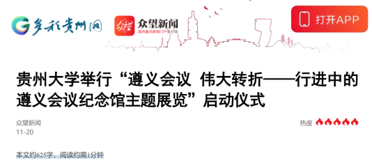 11月17日上午,“遵义会议 伟大转折——行进中的遵义会议纪念馆主题展览”启动仪式在贵州大学举行。贵州大学党委副书记骆长江,遵义会议纪念馆馆长周俊南、副馆长雷鸣出席仪式。启动仪式由贵州大学党委常委、宣传部部长、统战部部长杨楠主持。