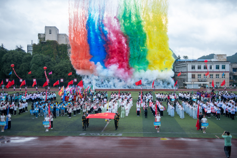 杨未宣布体育节开幕。数道彩烟齐发,直冲云霄。