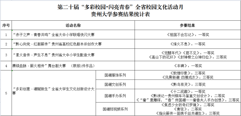 在“赤子之声·青春共鸣”全省大中小学联唱快闪大赛中,作品《祖国不会忘记》获得高校组一等奖。在“黔心向党·红剧薪传”贵州省高校红色剧本杀创作大赛中,作品《烽火不息》获得高校组一等奖。在“星火音传·声生不息”贵州省大中小学生配音大赛中,《觉醒年代》《君不见》获得高校组一等奖,《高山下的花环》《封神榜之众神归位》获得高校组三等奖。在“赓续血脉·薪火相传”舞台剧大赛中,作品《丰碑》获得高校组一等奖。在“多彩创意·潮赋新生”全省大学生文化创新设计大赛中,《敦煌印象》《风骨新潮 四雅成衣》获得国潮服饰系列三等奖;《黔鸟有灵》获得国潮文创系列三等奖;《十二泥趣》《黔洲记——贵州铜车马盲盒文创设计》《“奢”意雕琢,“香”传国潮——奢香夫人手办创想》分别获得国潮手办系列一等奖、二等奖、三等奖;《焦虑少女的奇幻梦境》《青弦》获得国潮短视频系列二等奖、《指尖薪传—苗绣千丝共潮生》获三等奖。