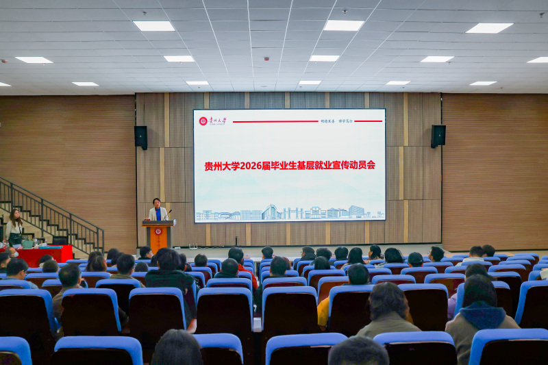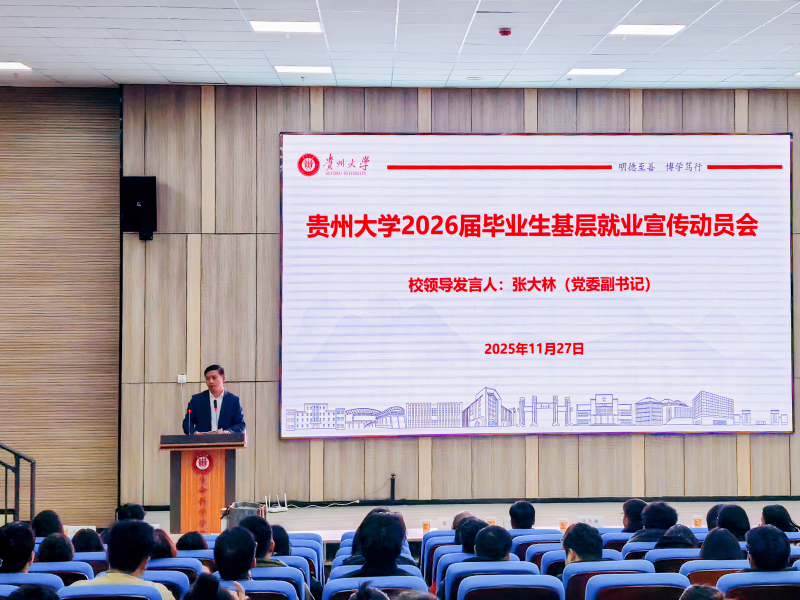 贵大新闻网讯(文字/学生记者 王世坤 摄影/学生记者 黄世娟)基层天地广阔,青年大有可为。11月27日下午,我校在西校区崇德楼104报告厅举行2026届毕业生基层就业宣传动员会,吹响了毕业生奔赴基层的集结号。校党委副书记张大林出席会议,校党委组织部部长罗卫刚参会,特邀专家、贵州大学文学院张军教授、往届优秀毕业生代表以及2026届毕业生代表参加。会议由招生就业处处长余颖主持。